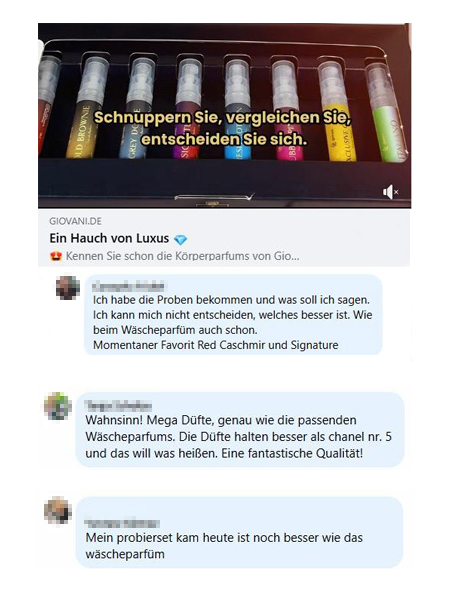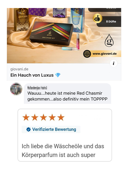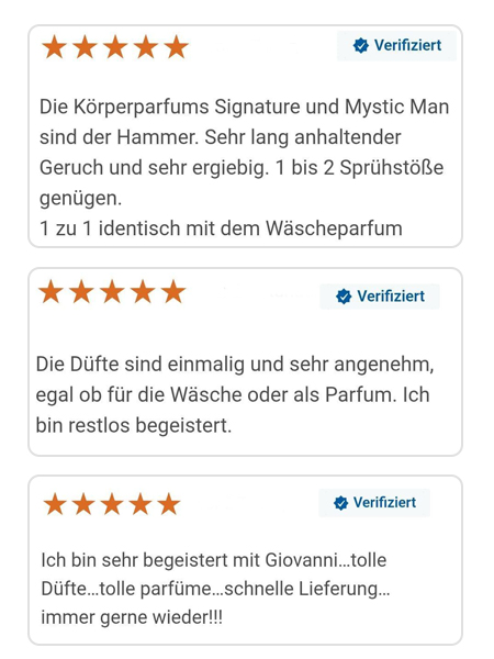 Giovani® ist eine luxuriöse Parfümmarke. Wir sind derzeit in 14 Ländern der EU vertreten und zählen über 1,6 Millionen zufriedene Kunden. Unsere Produkte werden langfristig mit über 99 % bewertet. Ausgezeichnet als Produkt des Jahres 2024 sowie als eShop des Jahres 2024.