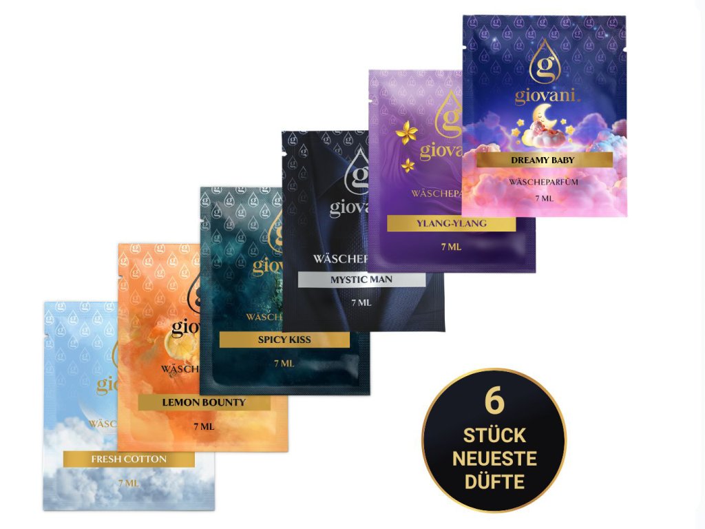 MIT PROBEN KÖNNEN SIE NICHTS FALSCH MACHEN Sie möchten nicht gleich mehr Geld ausgeben, weil Sie Giovani® Wäscheparfüms noch nicht kennen? Probieren Sie die Proben, beim nächsten Mal entscheiden Sie sich sicher für diese. |