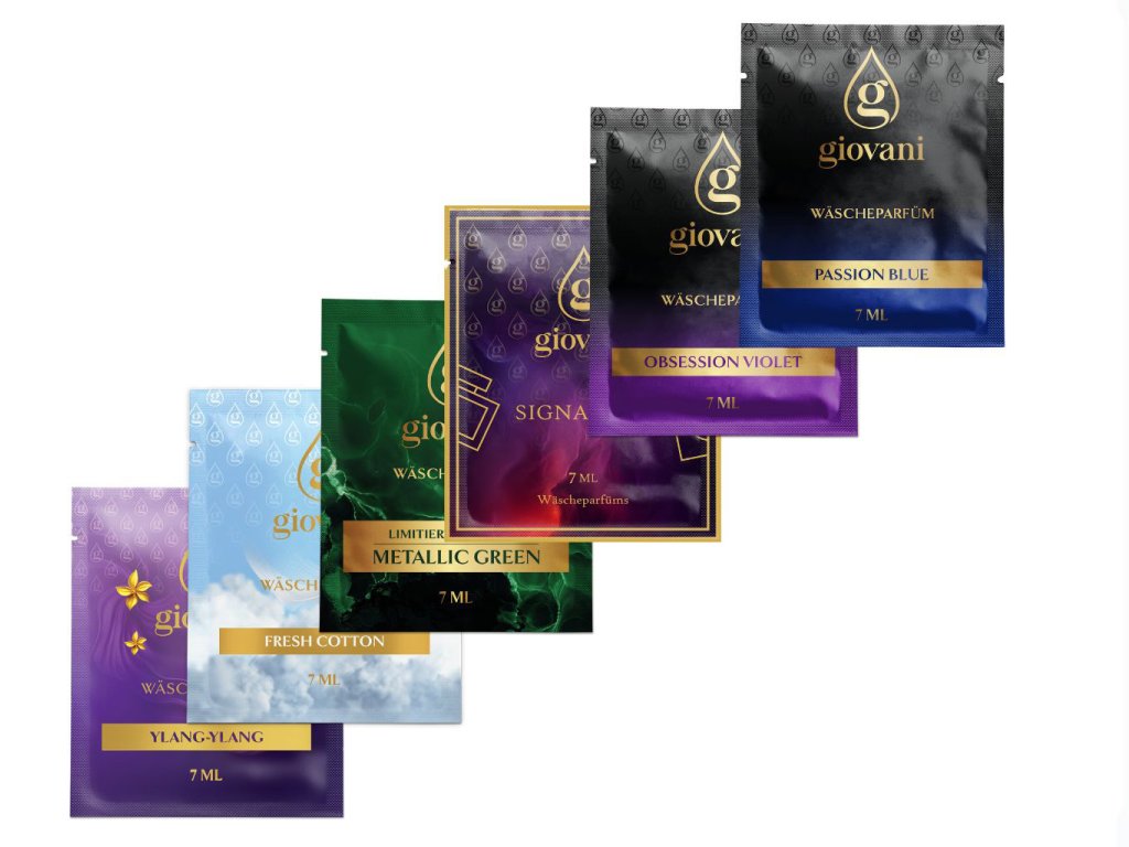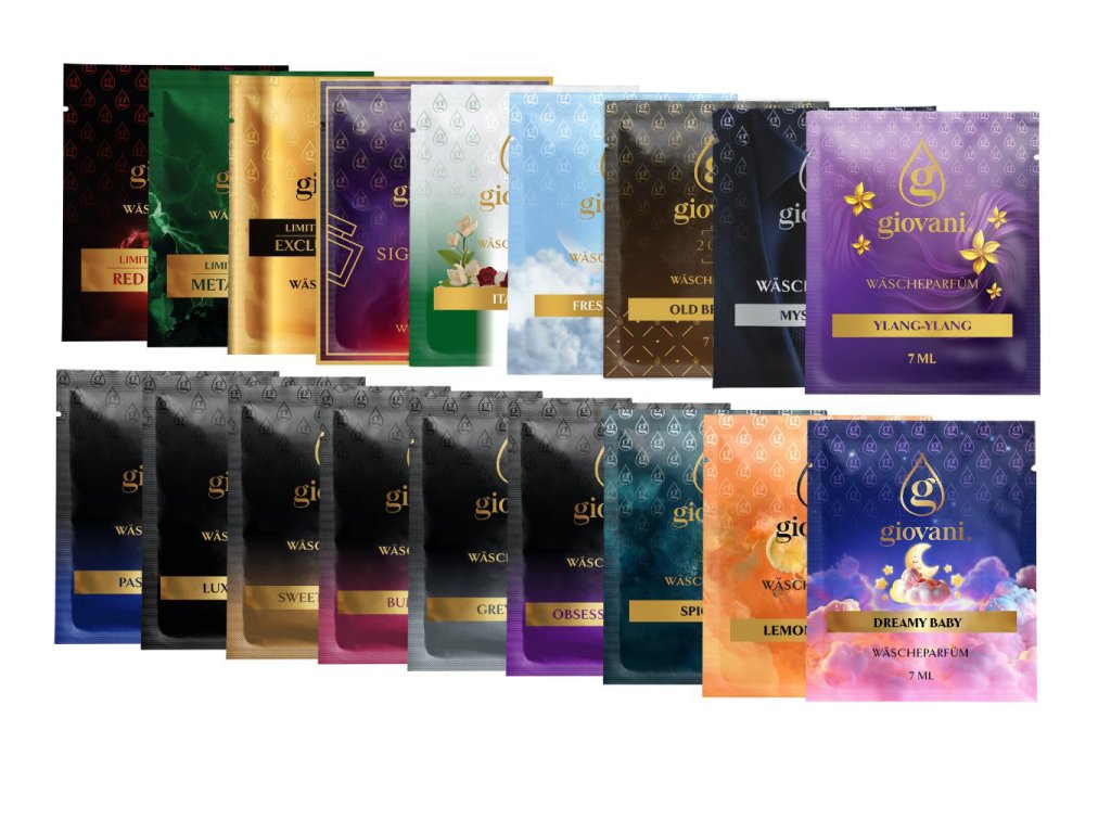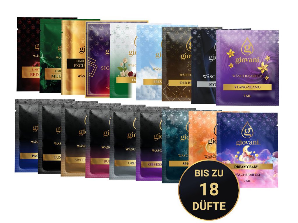 Giovani® ist eine exklusive und luxuriöse Marke für Wäscheparfüms. Auf ihre hohe Qualität haben wir besonders großen Wert gelegt. Bei der Entwicklung dieser Düfte war es uns wichtig, eine starke Intensität und eine lange Haltbarkeit zu erzielen, damit wir Giovani® als die hochwertigste Marke für Wäscheparfüms auf dem Markt bezeichnen können. Ihr großer Vorteil ist, dass sie die Waschmaschine nicht verstopfen, keinen schmierigen Belag und keine Flecken auf der Kleidung hinterlassen. Dank bestimmter Inhaltsstoffe pflegen unsere Öle auch die Farben Ihrer Wäsche. Sie sind vegan, enthalten kein Dioxan, kein Chlor, keine SVHC, Parabene, PBT/vPvB-Stoffe, Schwermetalle, schädliche Rückstände, Mikroplastik oder Nanoplastik. Die Einzigartigkeit der Marke Giovani® wird auch durch ihr luxuriöses Design unterstrichen. |