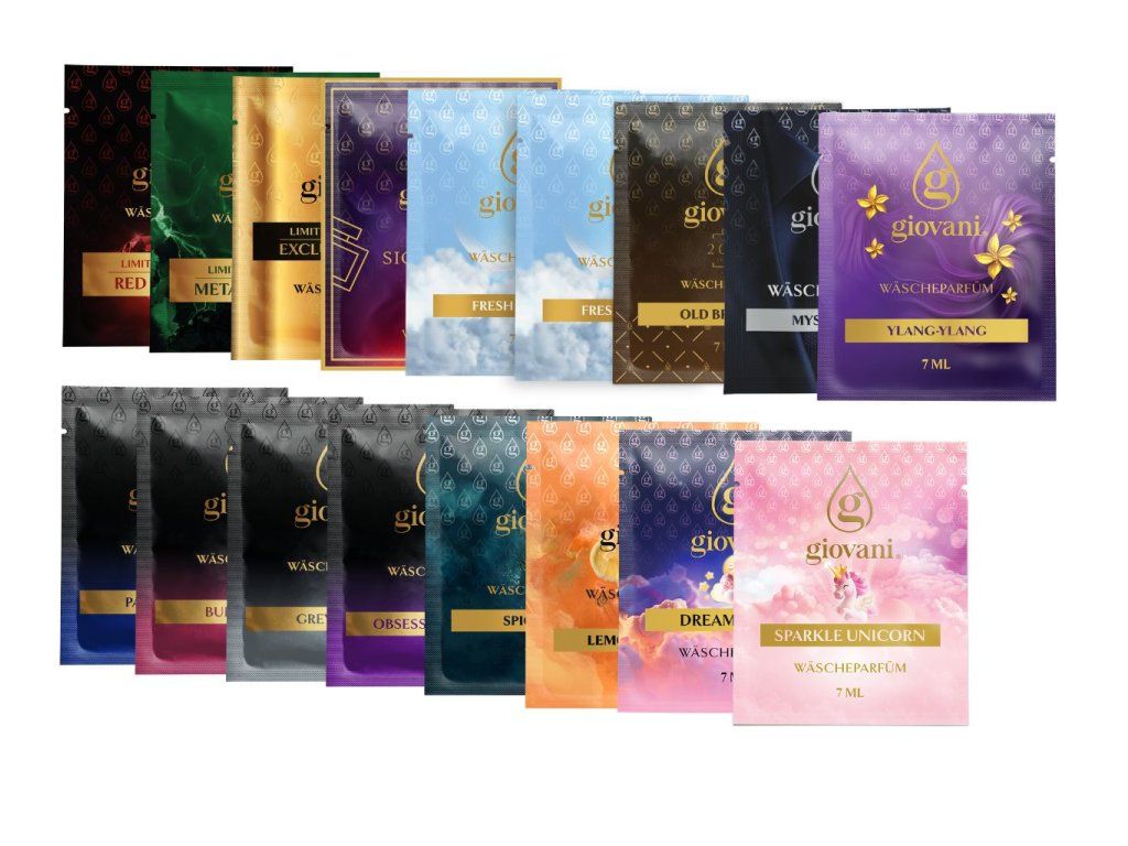 MIT PROBEN KÖNNEN SIE NICHTS FALSCH MACHEN Sie möchten nicht gleich mehr Geld ausgeben, weil Sie Giovani® Wäscheparfüms noch nicht kennen? Probieren Sie die Proben, beim nächsten Mal entscheiden Sie sich sicher für diese. |