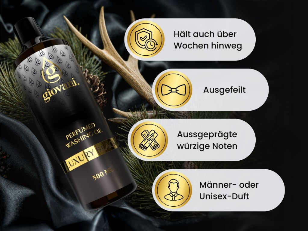 Eine Kombination aus würzigen und blumigen Parfümölen schafft das ultimative Dufterlebnis in Form dieses aldehydischen Duftes von GIOVANI's Luxury Black Wäscheparfüm.