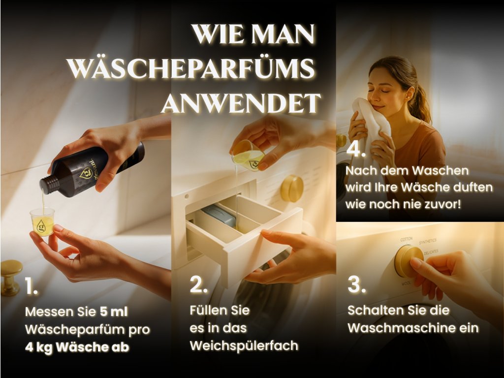 Geben Sie das Parfüm nicht in die Trommel der Waschmaschine oder in den Trockner. Sie sind direkt für die Verwendung im Weichspülerbehälter bestimmt. Sie müssen nicht befürchten, dass Ihre Wäsche nach dem Trocknen im Trockner ihren Duft verliert. Giovani®-Düfte sind resistent gegen äußere Einflüsse und langlebig. Die gewaschene Wäsche duftet auch nach dem Trocknen noch. Die optimale Temperatur für die Lagerung von Wäscheölen liegt bei ca. 15-25 Grad Celsius.