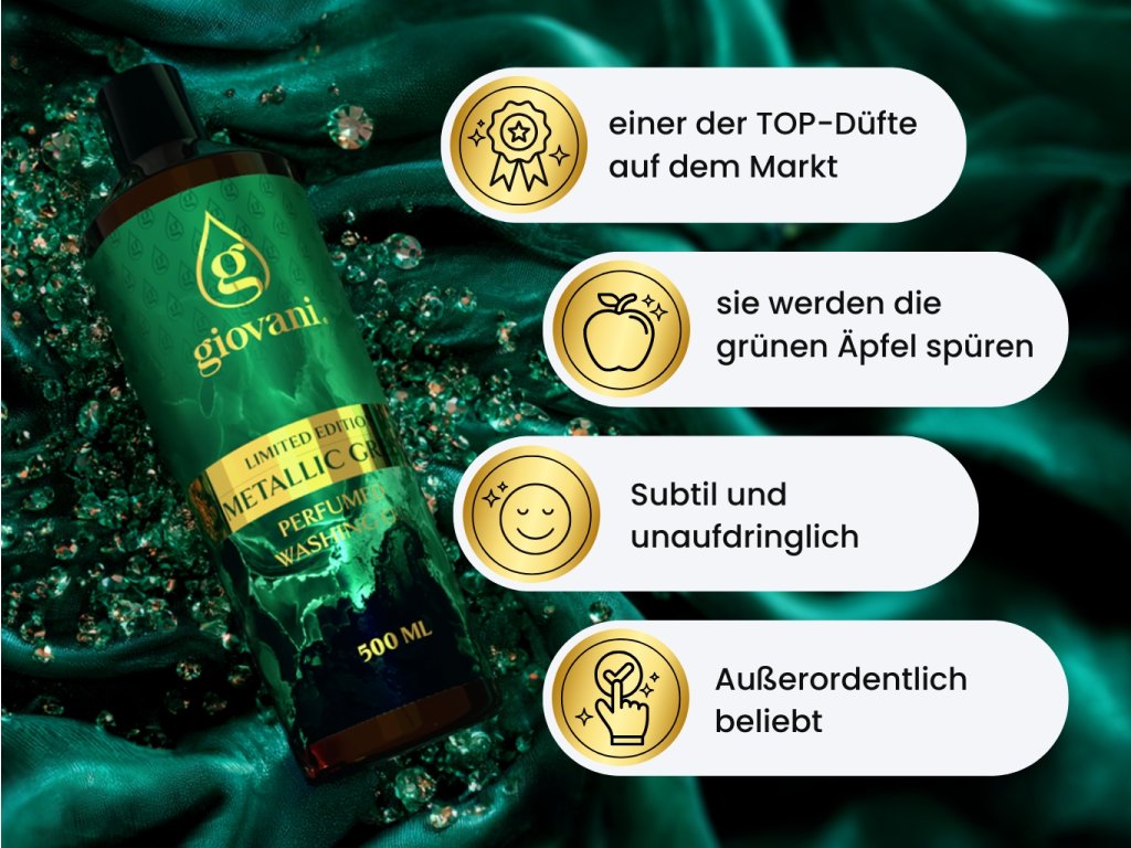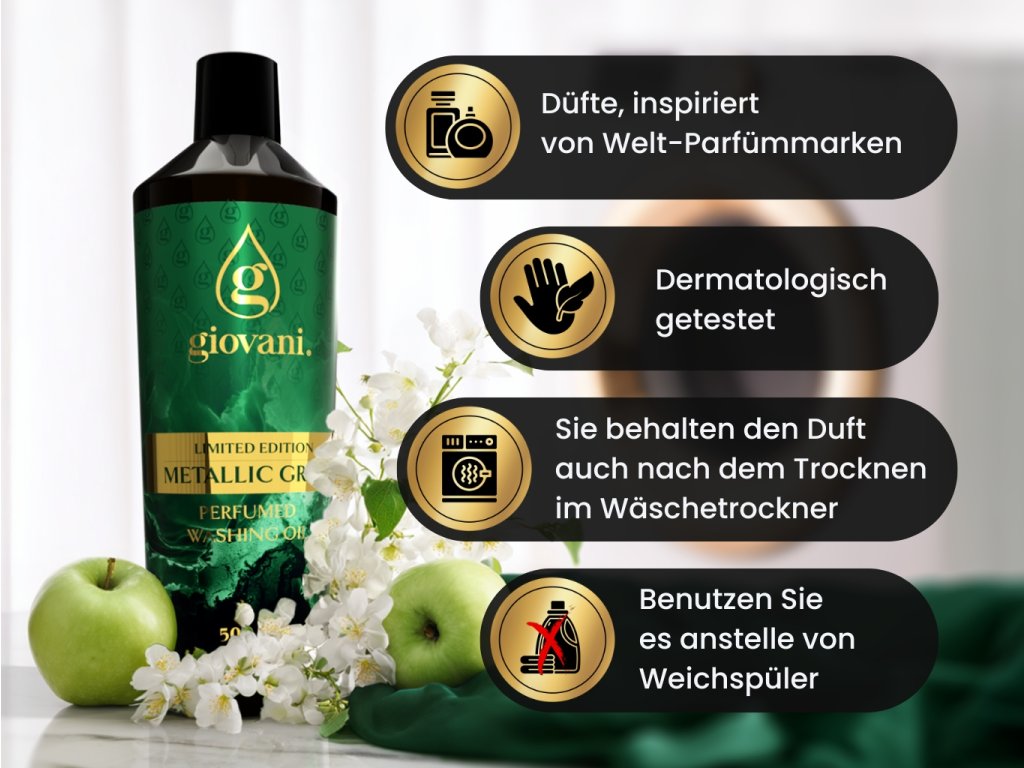 Die limitierte Edition GIOVANI® Metallic Green wurde mit dem Ziel der Einzigartigkeit und eines intensiven Dufterlebnisses kreiert. Nach dem Waschen duftet Ihre Wäsche und Ihr Zuhause noch lange nach einem süß-frischen Parfüm.