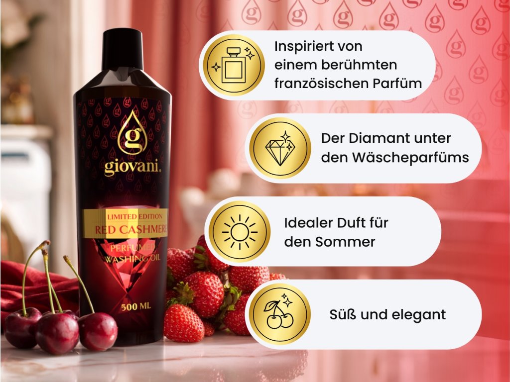 Giovani® ist eine exklusive und luxuriöse Marke für Wäscheparfüms. Auf ihre hohe Qualität haben wir besonders großen Wert gelegt. Bei der Entwicklung dieser Düfte war es uns wichtig, eine starke Intensität und eine lange Haltbarkeit zu erzielen, damit wir Giovani® als die hochwertigste Marke für Wäscheparfüms auf dem Markt bezeichnen können. Ihr großer Vorteil ist, dass sie die Waschmaschine nicht verstopfen, keinen schmierigen Belag und keine Flecken auf der Kleidung hinterlassen. Dank bestimmter Inhaltsstoffe pflegen unsere Öle auch die Farben Ihrer Wäsche. Sie sind vegan, enthalten kein Dioxan, kein Chlor, keine SVHC, Parabene, PBT/vPvB-Stoffe, Schwermetalle, schädliche Rückstände, Mikroplastik oder Nanoplastik. Die Einzigartigkeit der Marke Giovani® wird auch durch ihr luxuriöses Design unterstrichen. |