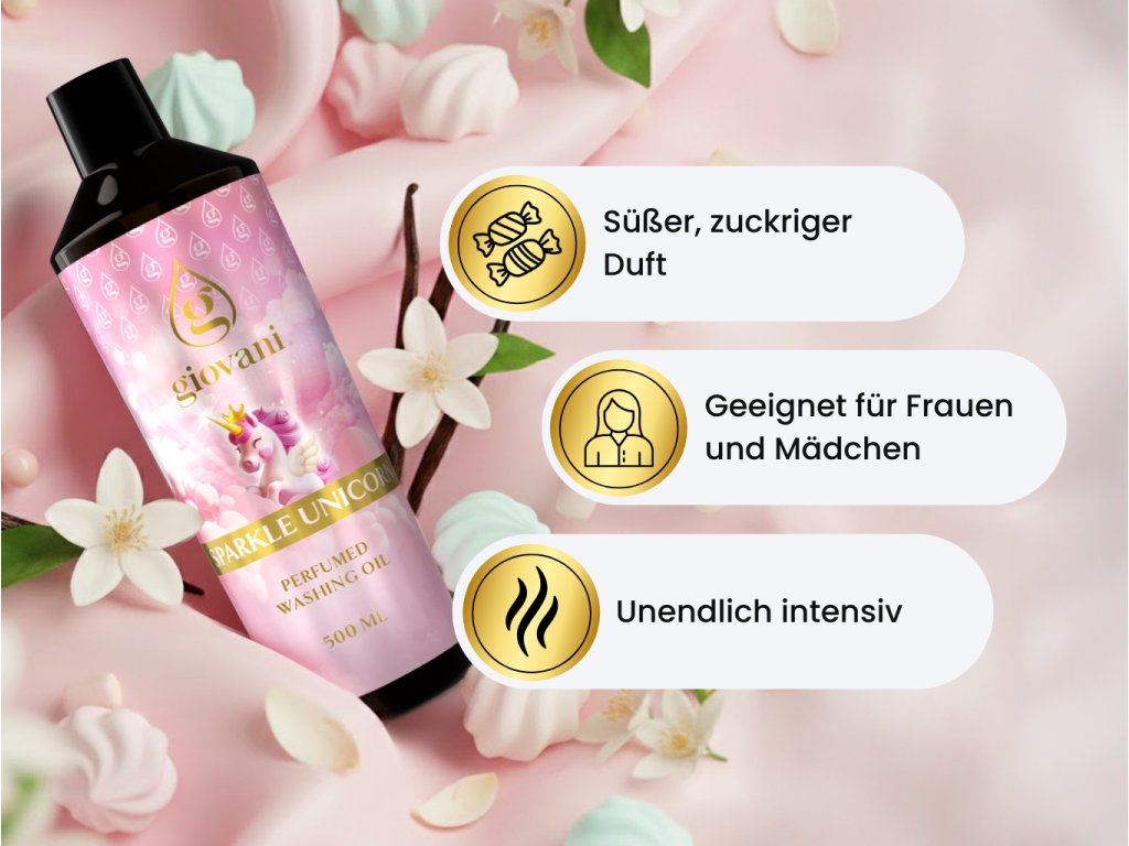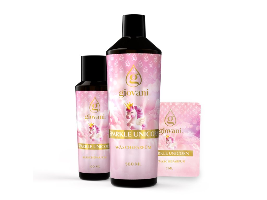 Das Wäscheparfüm SPARKLE UNICORN ist wie ein Tor in eine Fantasiewelt, in der alles rosafarben, süß und glitzernd erscheint. Sein intensiver Duft erinnert an einen bonbonartigen Traum und an das wunderbare Gefühl, sich in eine kuschelig weiche Decke einzuhüllen. Es ist für Frauen und Mädchen gedacht, die verspielte und entzückende Düfte lieben, die eine köstliche und unverwechselbare Spur hinterlassen.